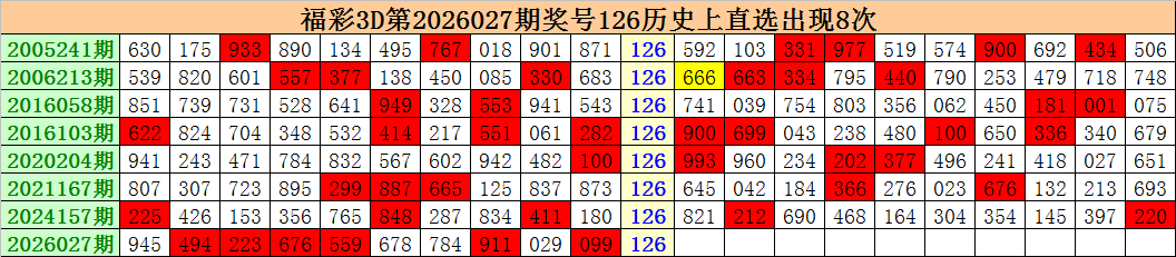 上期回顾:福彩3D第2026027期开出奖号126。