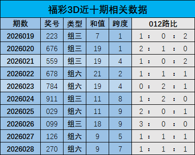 开奖回顾:福彩3D上期奖号为270,和值是9,跨度是7,其中奖号012路比为1:1:1。