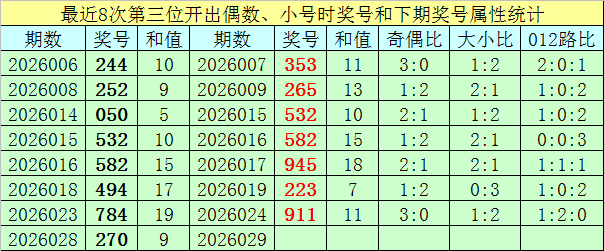 前7次第三位号码开出偶数、小 号时奖号分别为:244、252、050、532、582、494、784,其中奇偶总比例为7:14,有5期奇偶比与上期奇偶比相同;号码大小总比例为8:13,有4期奖号大小比与上期大小比相同;