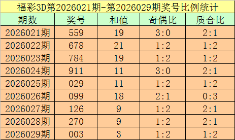 开奖回顾:福彩3D第2026029期:奖号为003,奖号质合比为1:2,大小比为0:3,跨度为3,类型为组三。