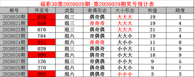 上期回顾:福利彩票3D第2026029期开奖结果003。奖号:偶偶奇、小小小,和值3,跨度3。