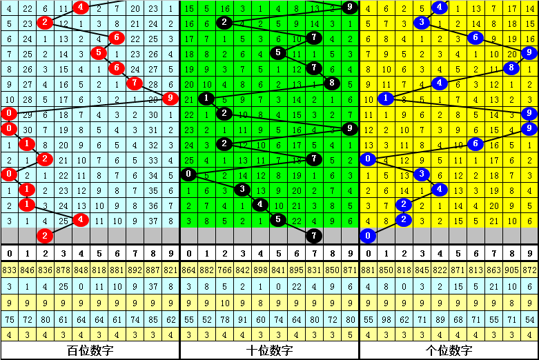组选分析:在0-9的组选分布图中,最近10期0-2区段开出15个号码,3-6区段开出8个号码,7-9区段开出7个号码,上期7-9区间没有落号,本期预计号码主要在两端热出,防3-6区段走冷。