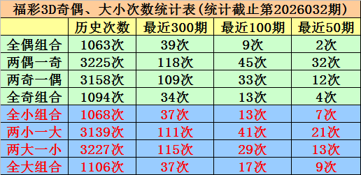 奇偶、大小分析:在最近50期开奖中,全偶组合开出2次,当前遗漏26期、两偶一奇组合开出32次,当前遗漏0期、两奇一偶组合开出12次,当前遗漏2期、全奇组合开出4次,当前遗漏8期,本期注意两偶一奇组合;全小组合出现7期,当前轮空1期、两小一大组合出现21期,当前轮空0期、两大一小组合出现13期,当前轮空6期、全大组合出现9期,当前轮空10期,本期看好开出两小一大组合。