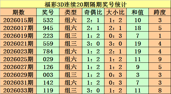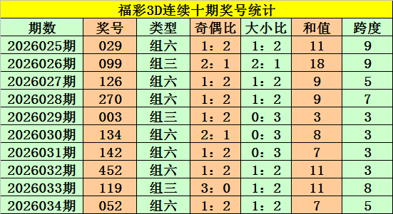 上期回顾:福彩3D第2026034期奖号:052。组六、小大小、偶奇偶。