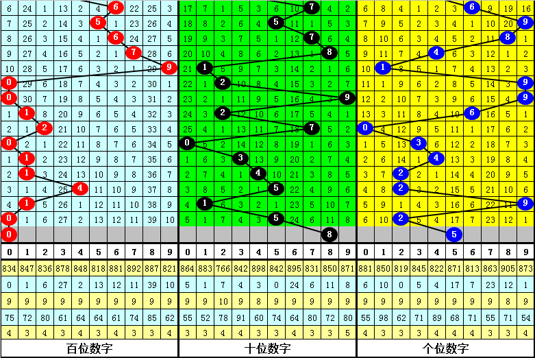 跨度:近5期跨度分布在3-8之间,振幅为6点,分布非常分散,上期跨度为5,下降3点,本期注意跨度走大,关注8区段。