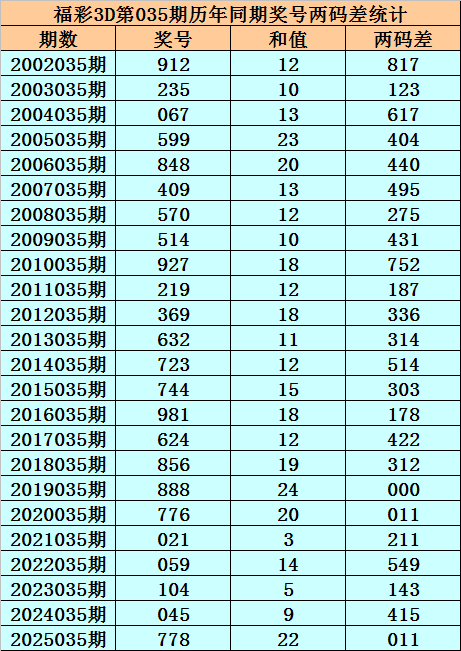 福彩3D第035期,历史上期开出24次奖号,其奖号分别为:912、235、067、599、848、409、570、514、927、219、369、632、723、744、981、624、856、888、776、021、059、104、045、778,奖号两码合差分别开出: