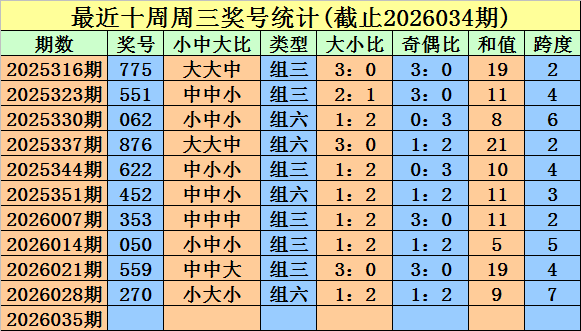 福彩3D第2026028期(上周三)奖号为270。