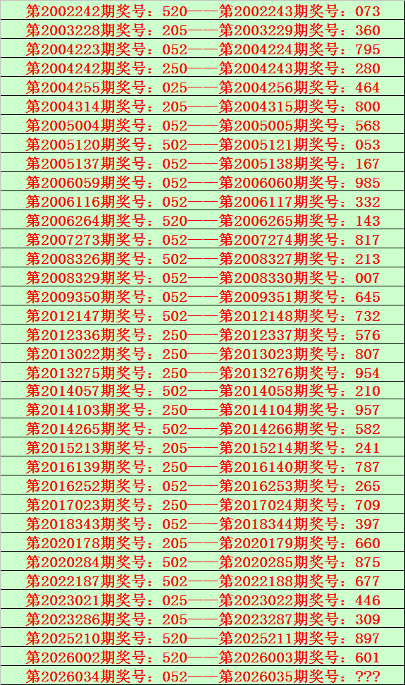 福彩3D第2026035期开奖日期:2026年2月4日,历史上第035期已开出了24次奖号,历年同期号码分别为:912、235、067、599、848、409、570、514、927、219、369、632、723、744、981、624、856、888、776、021、059、104、045、778。