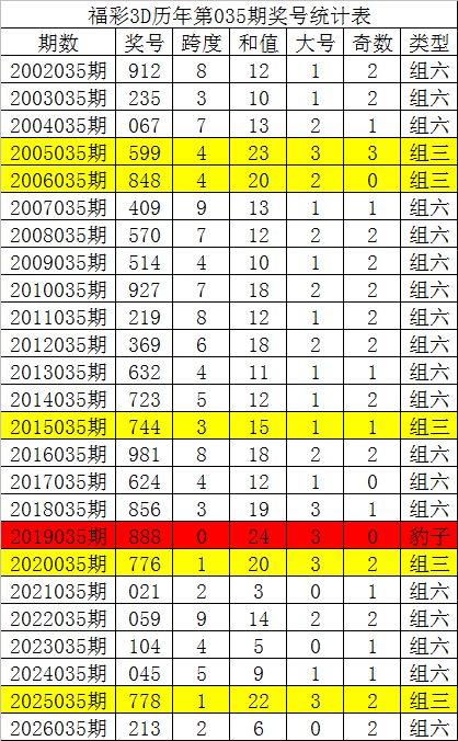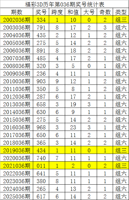 从以上统计可以看出,历年3D第036期开出了3次组三号码,开出了21次组六号码。组六号码出现概率大,本期预计开出组六号码。