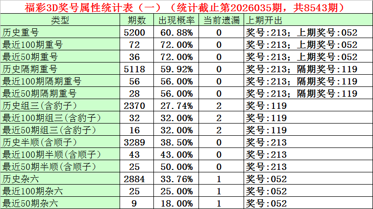 福彩3D第2026033期奖号为119,第2026035期奖号为213,隔期奖号出号1。从统计表中分析,最近100期隔期奖号出现56期,出现比例为56%,最近50期隔期奖号出现28期,出现比例为56%,最近10期隔期奖号出现 7期,出现比例为70%,本期防止隔期号中号码轮空。