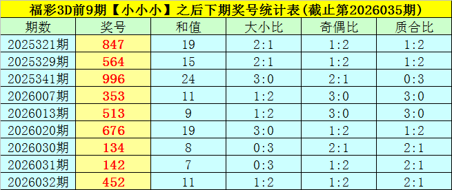 一、上期回顾:福彩3D第2026035期奖号为:213,奖号类型开出组六,大小比为0:3,奇偶比为2:1,和值为6,跨度为2,012路比为1:1:1。