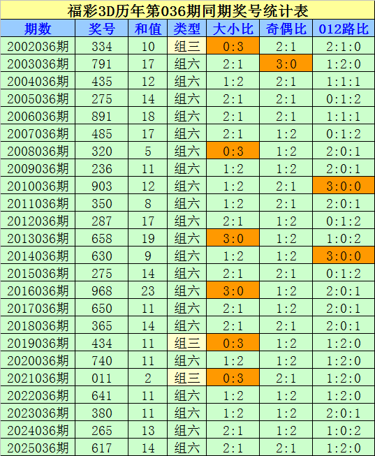 组选类型判断:在第036期历史同期开奖中,组六开出21次,组三开出3次,今年同期看好开出组六号码。
