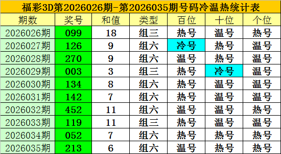 上期回顾:福彩3D第2026035期开奖奖号为:213,奖号类型为:组六,奖号冷温热态为:温号+热号+热号。