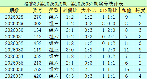 上期回顾:福彩3D第2026037期开奖号码为420,组选类型为组六,奇偶比为0:3,大小比为0:3。