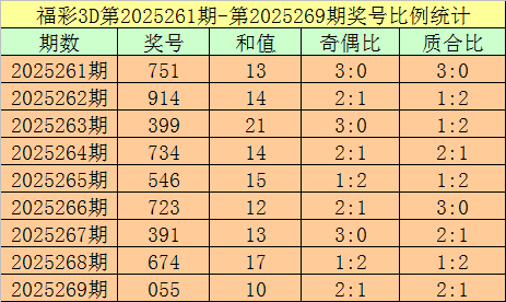 开奖回顾:福彩3D第2025269期:奖号为055,奖号质合比为2:1,大小比为2:1,跨度为5,类型为组三。