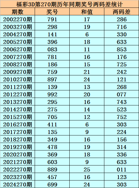 福彩3D第270期,历史上期开出23次奖号,其奖号分别为:791、298、141、396、083、781、186、759、897、139、992、295、275、705、411、135、349、478、369、603、889、457、699,奖号两码合差分别开出: