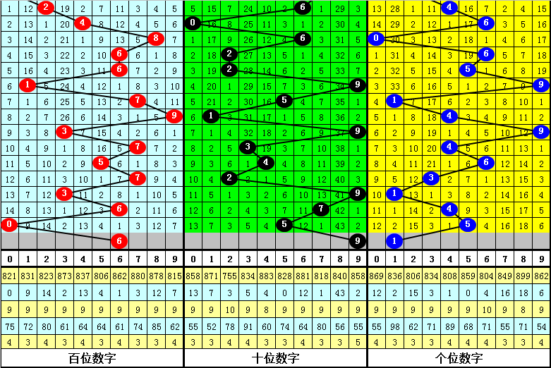 组选分析:在0-9的组选分布图中,最近10期0-2区段开出6个号码,3-6区段开出14个号码,7-9区段开出10个号码,上期7-9区间没有落号,本期看好各区间分别开出1个奖号,