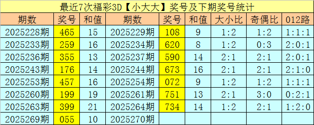 一、福彩3D上期奖号为055,大小类型开出:小大大,历史上该大小类型奖号共出现1074次,最近7次【小大大】奖号分别开出:465、259、355、176、457、199、399,其中组三号码出现3次,组六号码出现4次。