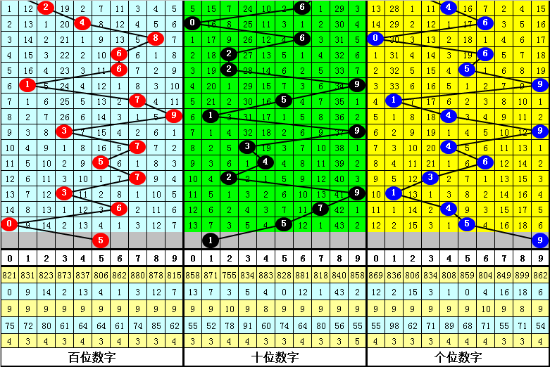 号码频次分析:最近10周星期六各号码组选出现频次分别为:号码0、7、9出现5次,号码5出现4次,号码4出现3次,号码1、2、6、8出现2次,号出现1次,号码3没有出现,本期注意最热四码:0579中包含胆码,预计奖号不会全部分布在最冷四码:2368中。