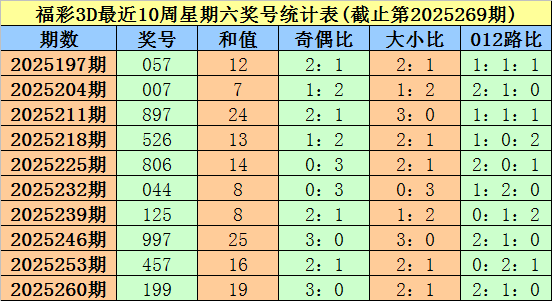 福彩3D第2025260期(上周星期六)奖号为199。其中奖号奇偶比为3:0,大小比为2:1,012路比为2:1:0。