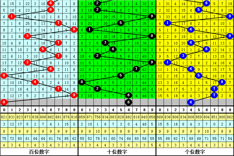百位号码:连续两期百位出号分别为:7-9,历史上福彩3D连续两期前后分别出号7-9的奖号共出现81次。在百位7-9的奖号现象出现时,近15期下期分别出号:853-144-023-356-184-811-567-228-541-214-016-701-734-806-399;