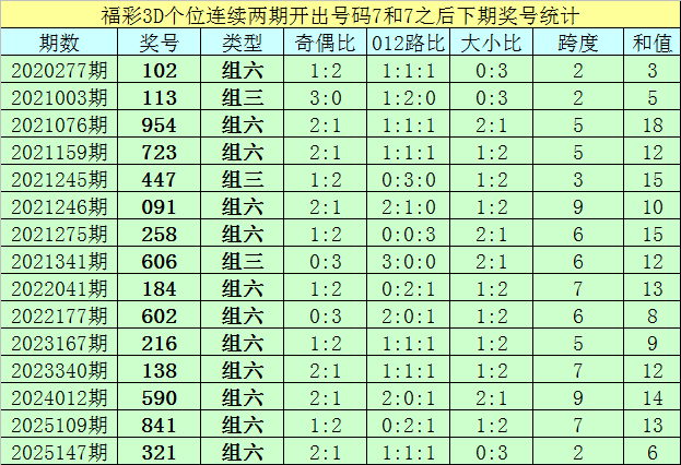 个位号码:最近两期个位开出号码为7-7,在福彩3D历史开奖中,前后两期个位分别开出号码7-7的奖号出现了78次。最近15期个位7-7组合出现之后,其下期奖号分别为:102-113-954-723-447-091-258-606-184-602-216-138-590-841-321;