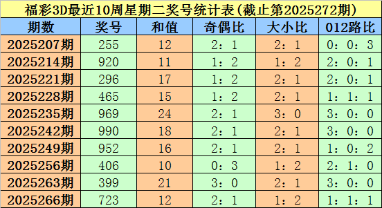 福彩3D第2025266期(上周星期二)奖号为723。其中奖号奇偶比为2:1,大小比为1:2,012路比为1:1:1。