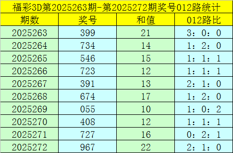 上期回顾:福彩3D第2025272期开出奖号:967。奖号为组六形态,与试机号没有同,奇偶比为2:1,大小比为3:0,012路比为2:1:0,和值为22,跨度为3。