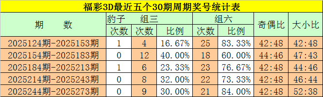 在最近一个30期周期内(第2025244期-第2025273期),豹子奖号没有出现,组三奖号开出了9次,所占比例为36%,组六奖号共出现21期,开出比例为84%,组六号码连续出现2期,表现非常活跃,本期预计奖号为组六号码。