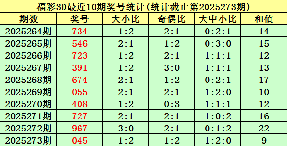 开奖回顾:福彩3D第2025273期奖号为:045。奖号类型为组六,和值为9,奇偶比为1:2,跨度为5,012路比为1:1:1,大小比为1:2。