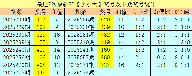 二、最近7次【小小大】奖号之后,其下期分别开出号码:920、439、732、419、160、860、727,其中组三号码出现1次,组六号码出现6次。本期预计开出组六号码。