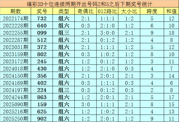 十位号码:前两期十位分别出现奖号2-5,历史上福彩3D连续前后分别开出号码2-5的现象共开出87次。在十位2-5的现象出现时,最近15期其下期分别开出号码:732-640-099-512-372-802-245-430-356-402-224-863-159-625-902;