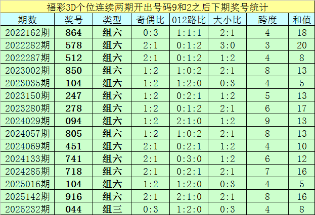 个位号码:最近两期个位开出号码为9-2,在福彩3D历史开奖中,前后两期个位分别开出号码9-2的奖号出现了83次。最近15期个位9-2组合出现之后,其下期奖号分别为:864-578-512-850-104-247-278-094-805-451-741-718-104-916-044;