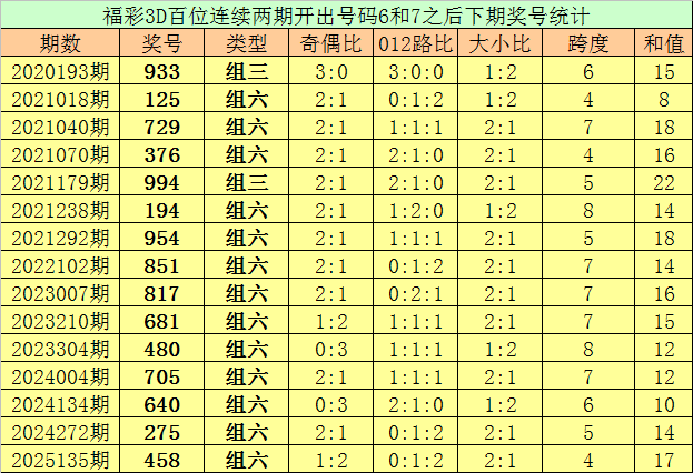 百位号码:连续两期百位出号分别为:6-7,历史上福彩3D连续两期前后分别出号6-7的奖号共出现77次。在百位6-7的奖号现象出现时,近15期下期分别出号:933-125-729-376-994-194-954-851-817-681-480-705-640-275-458;