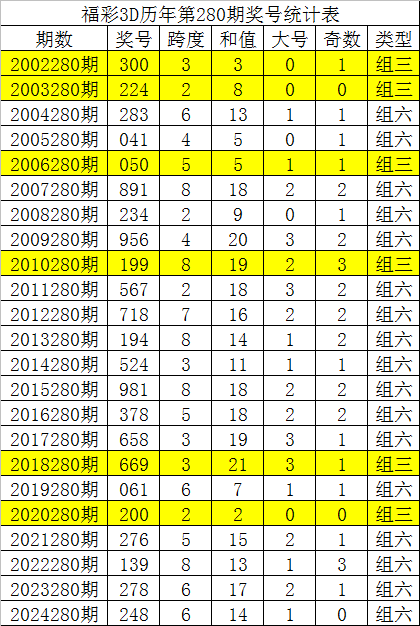 福彩3D历年第280期同期分别开出奖号:300、224、283、041、050、891、234、956、199、567、718、194、524、981、378、658、669、061、200、276、139、278、248,详细统计见下表: