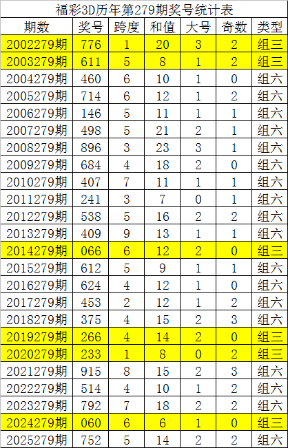 从以上统计可以看出,历年3D第280期开出了6次组三号码,开出了17次组六号码。组六号码出现概率大,本期预计开出组六号码。