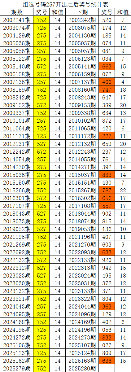 福彩3D第2025279期开出组选号码:257,该号码历史上组选出现了46次,其下期分别开出了号码:520、174、185、074、081、034、663、072、400、747、647、389、634、872、420、227、659、237、761、392、833、430、787、656、557、902、815、136、407、603、633、920、942、495、372、371、804、363、129、402、056、833、027、809、636,如图: