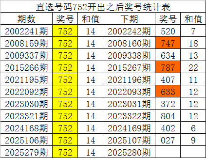 从以上统计可以看出,直选号码752出现之后,其下期奖号:1.下期偶数号码出现概率100%;