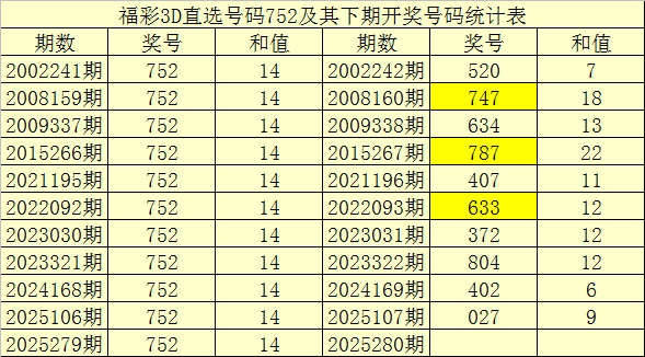 一、开奖回顾:第2025279期福彩3D奖号为752。奖号奇偶比为2:1,和值为:14,跨度为:5。