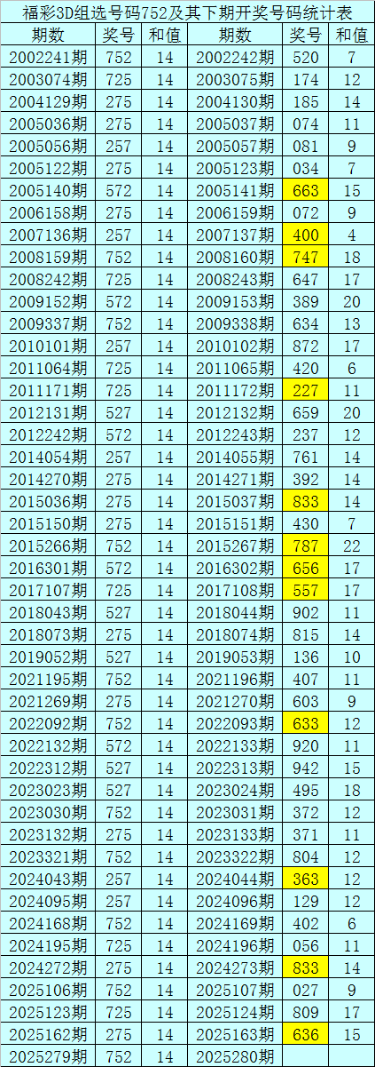 二、组选分析:历史上组选号码752开出了46次,其下期奖号分别为:520-174-185-074-081-034-663-072-400-747-647-389-634-872-420-227-659-237-761-392-833-430-787-656-557-902-815-136-407-603-633-920-942-495-372-371-804-363-129-402-056-833-027-809-636,其开出期数和下期奖号统计为: