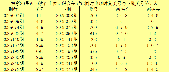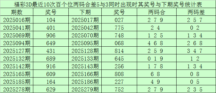 从以上统计可以看出,百十位两码合差5与3同时出现之后其下期两码合差表现最热的4个分别为:0246,本期百十位两码合差可以参考这四码中的数据。