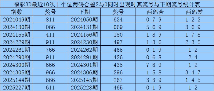从以上统计可以看出,十个位两码合差2与0同时出现之后其下期两码合差表现最热的4个分别为:1239,本期十个位两码合差可以参考这四码中的数据。