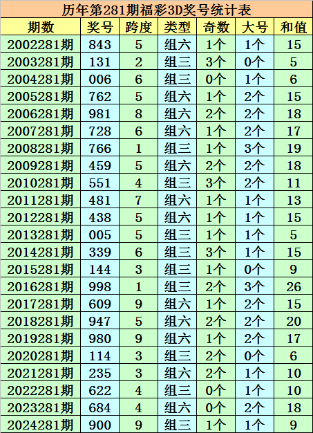 历年第281期福彩3D同期奖号为:843 - 131 - 006 - 762 - 981 - 728 - 766 - 459 - 551 - 481 - 438 - 005 - 339 - 144 - 998 - 609 - 947 - 980 - 114 - 235 - 622 - 684 - 900。