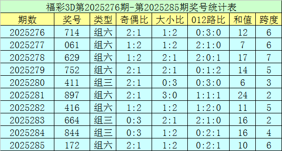 上期回顾:福彩3D第2025285期开奖号码为172,组选类型为组六,奇偶比为2:1,大小比为1:2。