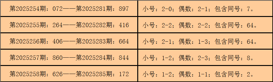 统计3D历史上已开出的奖号发现,在连续5期开奖号码中:3D在第2025254期-第2025258期分别开出奖号:072-264-406-860-626。
