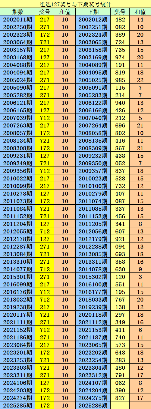 第2025285期3D奖号组选为:127,历史上该号码组选出现52次,下期号码分别为:482、082、389、724、735、974、191、819、985、115、214、940、426、212、696、802、416、867、438、052、837、528、732、407、087、337、456、341、607、921、094、693、358、630、120、551、195、767、138、297、349、411、740、573、648、283、480、791、062、390、827。