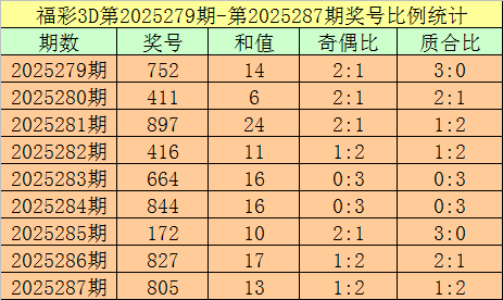 开奖回顾:福彩3D第2025287期:奖号为805,奖号质合比为1:2,大小比为2:1,跨度为8,类型为组六。