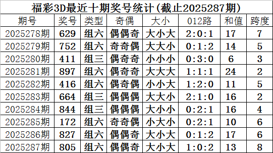 开奖回顾:福彩3D第2025287期奖号为805,奖号形态为:组六、大小大、1:0:2、偶偶奇。