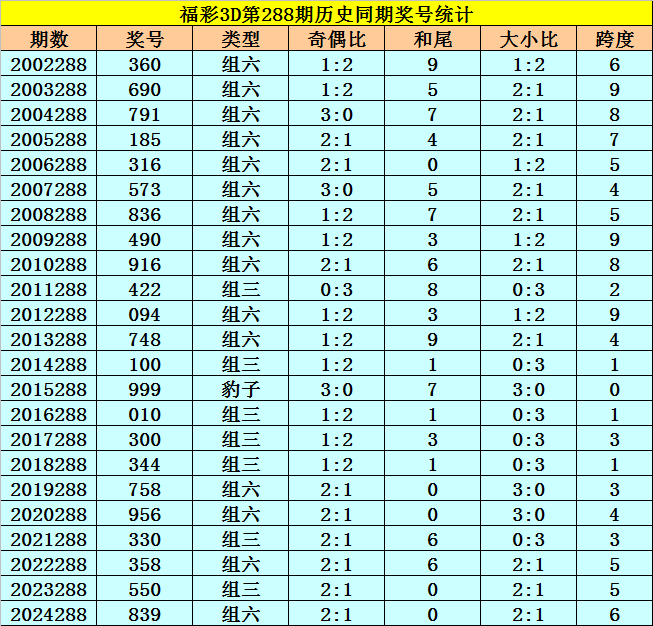 福彩3D历年第288期同期奖号为:360 690 791 185 316 573 836 490 916 422 094 748 100 999 010 300 344 758 956 330 358 550 839。