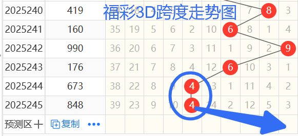 依次是69644跨度,按照路数转换关系来看,那么跨度我们暂定258369跨,本期个人比较看好9 5跨。